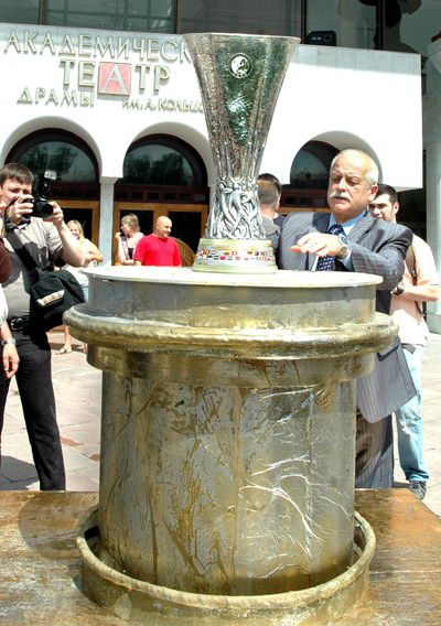 Кубок УЕФА, путешествующий по городам России, вчера добрался и до Воронежа. Трофей питерского «Зенита», завоеванный в финальном матче с шотландским "Рейнджерсом" при счете 2:0, был выставлен в Воронеже, на площади академического театра драмы имени А.В.Кольцова.