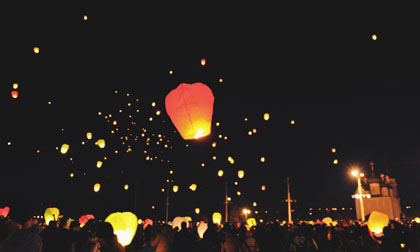 Фонарики, которые сделаны из легкой рисовой бумаги в виде купола с прикрепленной к ней горелкой, можно было купить здесь же. Планировалось, что обладатели фонариков зажгут их и отпустят в свободный полет по команде организаторов. Однако многие не стали ждать - небесные фонарики взмыли ввысь за несколько минут до сигнала. Впрочем, красоту и веселое настроение вечера это не испортило..