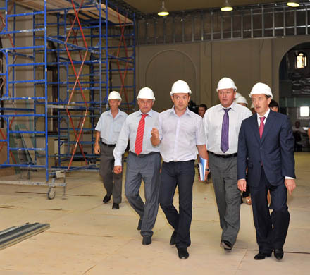 Губернатор побывал также в фойе первого и второго этажа. Он посмотрел, как ведется отделка пола, заглянул в одну из гримерок, где уже начата установка специальной мебели, а затем осмотрел блок административно-хозяйственных помещений.