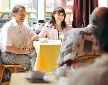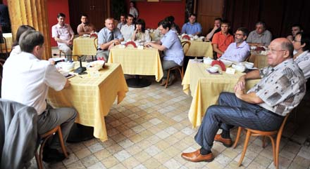 Подчеркивая неофициальный формат встречи, Алексей Гордеев перед началом разговора снял галстук и поздравил с днем рождения главного редактора телевизионного канала «Край Воронежский» Александра Умнова.