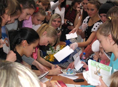Надо сказать, что блистательная гимнастка с удовольствием общалась с участниками фестиваля. Дарила им автографы, давала советы, фотографировалась с юными спортсменами. Маленькая Яна Лебедева, которой всего-то четыре года, и она лишь месяц назад стала заниматься гимнасткой, с восторгом смотрела на чемпионку мира.