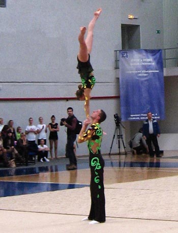 Эстафету фестиваля подхватили самые юные его участницы - команда школы "Резонанс" "Звездочки". Анна Дзюба, представлявшая команду Воронежского государственного университета по спортивной аэробике, четко и красиво выполнила технически сложные элементы, объединенные в спортивный танец.
