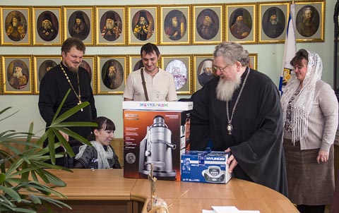 Кроме денежных средств Владыка Сергий вручил детям и родителям подарки, необходимые в повседневном быту каждой семьи: современные соковыжималки, музыкальные центры и детские настольные игры.