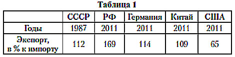 Как видим, в СССР превышение экспорта над импортом составляло всего 12 процентов. Это близко к нынешним показателям Германии и Китая. Но вот в РФ в настоящее время вывоз товаров превышает импорт более чем в полтора раза (на 69 процентов). Иное дело США. В 2011 году здесь за счет собственного производства покрывали только две трети импорта, а расчеты с поставщиками за остальные ввозимые ресурсы перекладывались на поставщиков, - под долговые обязательства, обеспеченные правом печатать доллары.