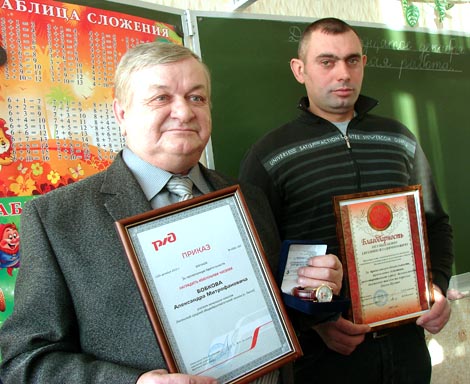 За бдительность, смелые и решительные действия, предотвратившие возможные тяжелые последствия на железной дороге, начальник ЮВЖД Анатолий Володько наградил сельского учителя Александра Бобкова и его бывшего ученика, бригадира путейцев Евгения Неумывакина именными часами