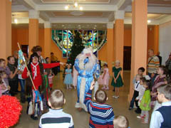 В холле культурного центра детей и взрослых развлекали Дед Мороз и Снегурочка, Баба Яга и Леший, Вьюга и Матрешка. Театральной студией центра был показан кукольный спектакль "Дюймовочка". В праздничной программе были хороводы вокруг елки, веселые конкурсы. Все дети получили новогодние сладкие подарки.
